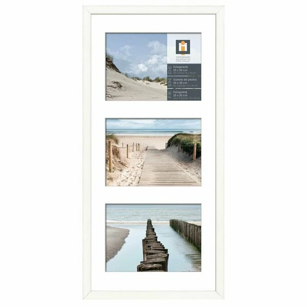 Gleich drei Fotos von schönen Erinnerungen können Sie in diesem Bilderrahmen platzieren. Die Bilder werden mit einer Plexiglasscheibe geschützt. Der etwa 23 x 50 cm große Bilderrahmen ist in verschiedenen Farben erhältlich.
