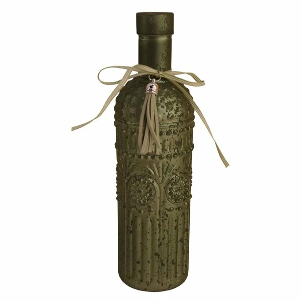 Schaffen Sie sich mit dieser salbeifarbenen Deko-Flasche eine stilvolle und gemütliche Atmosphäre in Ihrem Zuhause. Die 24 Zentimeter hohe Glasflasche besticht durch ihre Verzierungen. Der Dekohänger und die Schleife runden das Design zusätzlich ab.