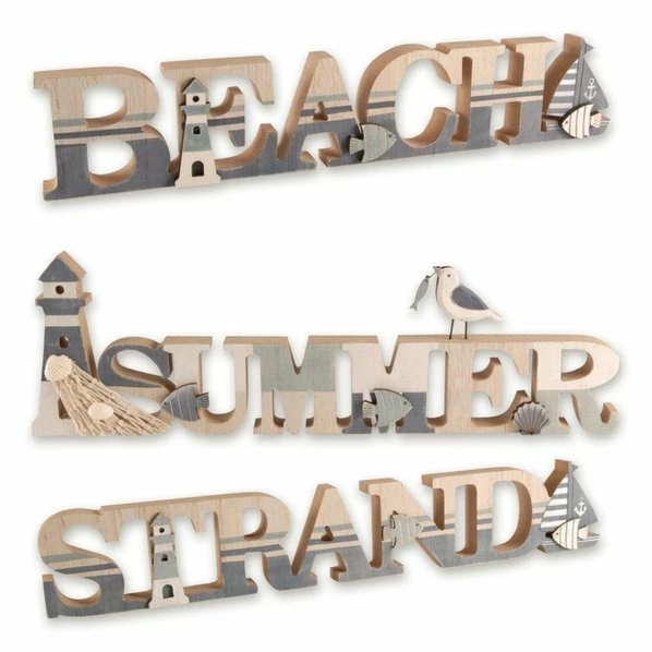 Das tolle Dekowort mit Maritimen-Motiven bekommen Sie in Ihrem nächstgelegenen ROLLER-Markt mit den Schriftzügen BEACH, SUMMER und STRAND.