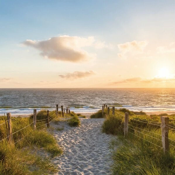 Mit dem Strandbild bringst du dich in deinen Gedanken immer wieder an den Ort, der dir wunderschöne Erinnerungen weckt. Der Weg der zum Wasser führt, mit den seitlich angebrachten Zaunelementen, lässt dich glauben hautnah dabei zu sein und der Sonnenuntergang in romantischen, rot-orangen Tönen trägt zur paradiesischen Stimmung bei und strahlt ein beruhigenden Flair aus.