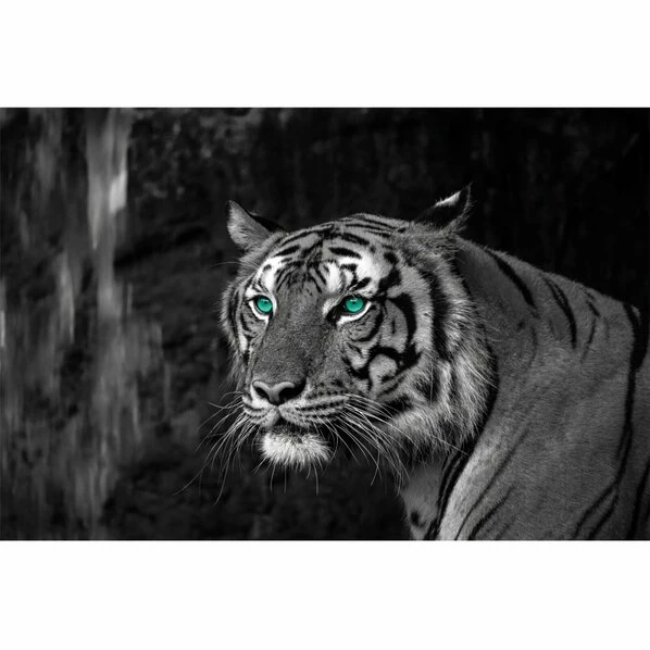 Dieses wunderschöne Keilrahmenbild zeigt einen Tiger in Nahaufnahme, wobei die türkisfarbenen Augen herausstechen. Die Farbkombination zwischen der schwarz-weißen Gestaltung und der türkisfarbenen Augen setzt die wilde Schönheit des Tieres in Szene und verleiht dem Bild sein gewisses Etwas. Du kannst selber entscheiden, in welchem Bereich du es aufhängen möchtest, denn egal ob im Eingangsbereich, im Wohnzimmer oder über dem Bett, dank des kompakten Formats findet das Motiv schnell ein passenden Platz in deinem Zuhause.