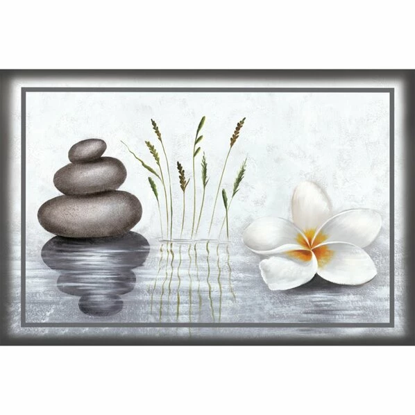 Die LotusblĂŒte, die GrĂ€ser, der dreistöckige Kieselsteinstapel und das klare Wasser, welches im Bodenbereich zu sehen ist, sorgen fĂŒr eine beruhigende AtmosphĂ€re, welche dich entspannen lĂ€sst. Daher sollte das Bild im Wohnzimmer oder Schlafzimmer hĂ€ngen, wo es öfter angeschaut wird und hervorragend wirken kann.