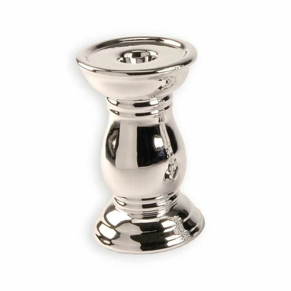 Schöner Kerzenständer in Silberfarben mit glänzender Oberfläche. Der Ständer besteht aus Dolomit und hat eine Höhe von ca. 17 cm.