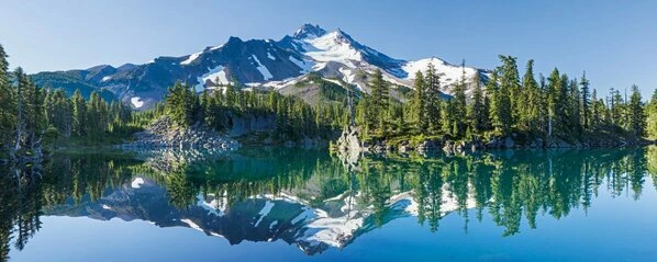 Idyllisch erstreckt sich vor einem schneebedeckten Gebirgszug ein See, in dem sich Bäume spiegeln. Das Bild wird auf ausgewähltem Canvas-Gewebe gedruckt und überzeugt mit exakten Konturen und einer hohen Auflösung.