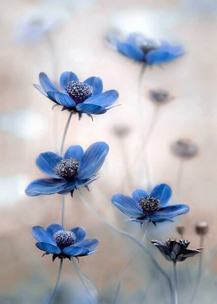 Zart entfaltet die blaue Kosmos-Blume ihre Blütenblätter und bietet einen wunderbaren, beruhigenden Anblick. Das Motiv wird auf ausgewähltem Canvas-Gewebe gedruckt und überzeugt mit exakten Konturen und einer hohen Auflösung.