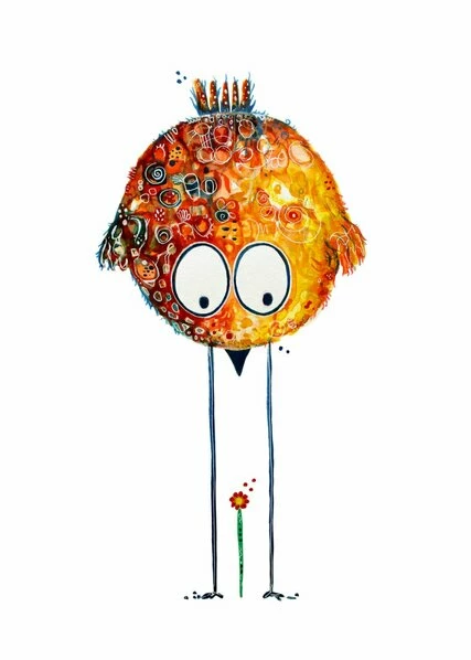 Der kleine Vogel mit seinen großen Augen betrachtet interesiert eine Blume auf dem Boden. Inspirierendes Motiv, das auf Canvas-Gewebe gedruckt ist, und damit die Darstellung exakter Konturen besonders gut zulässt.