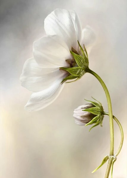 Wunderbar weiß entfaltet die Kosmos-Blume ihre Blütenblätter. Ein zauberhafter Anblick, gedruckt auf ausgewähltem Canvas-Gewebe mit exakten Konturen und einer hohen Auflösung.