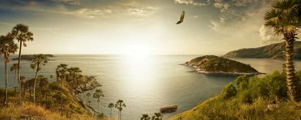 Ein paradiesischer Blick auf eine einsame Bucht am Meer. Genießen Sie den wunderbaren Anblick im Querformat. Bei der Leinwand handelt es sich um ein ausgewähltes Canvas-Gewebe, welches die Darstellung exakter Konturen zulässt.