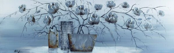 Holen Sie sich dieses schöne und handgefertigte Ölgemälde nach Hause. Die Vasen mit den wunderschönen Blumen sind in Blau und Silber gehalten. Das Motiv wird ein Hingucker in jedem Raum.