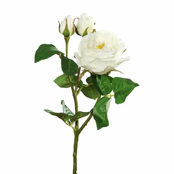 Verschönern Sie Ihren Wohnraum mit dieser lebendig aussehenden Rose in einem cremigen Weiß. Die Kunstpflanze besteht aus einer auffällig schönen Blüte und zwei Knospen. Die etwa 46 Zentimeter lange Pflanze passt ideal in eine schlichte Vase, damit Sie Ihre Inneneinrichtung dekorativ gestalten können.