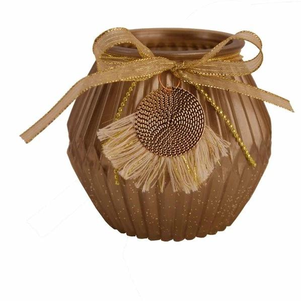 Trendiges Windlicht im Farbton Champagner. Es besteht aus Glas und hat einen Durchmesser von neun Zentimeter. FĂŒr ein Highlight sorgt die groĂe goldene Schleife und der runde DekoanhĂ€nger mit Fransen.
