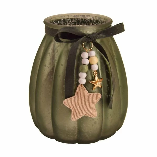 Mit diesem sehr dekorativen salbeifarbenen Windlicht machen Sie es sich Zuhause richtig gemĂŒtlich. Ausgestattet mit einer Schleife und Dekosternen ist es ein echter Hingucker. Das Glas hat einen Durchmesser von 15,5Â Zentimeter und passt perfekt in Ihre Wohnung oder auf Ihren Balkon.